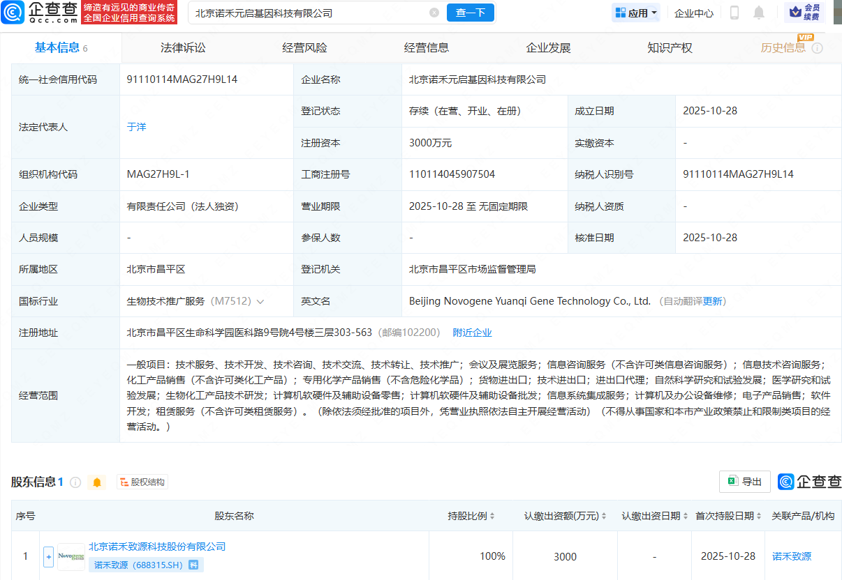 近日,北京诺禾元启基因科技有限公司成立,法定代表人为于洋,注册资本为3000万元,经营范围包含:自然科学研究和试验发展;医学研究和试验发展;生物化工产品技术研发;电子产品销售等。企查查股权穿透显示,该公司由诺禾致源(688315)全资持股。